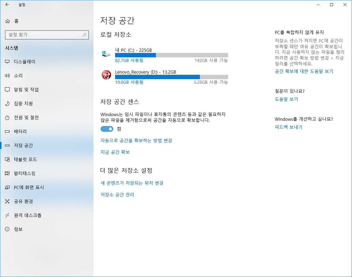 시작 > 설정 > 시스템 > 저장 공간에서 저장 공간 센스를 활성화시킨다. 그런 후, ‘자동 공간 확보 방법 변경’ 링크를 클릭해 더 세부적으로 설정을 한다. 필자는 매일 저장 공간 센스가 실행되도록 설정해 놓았다. 그러나 30일 이상 지난 파일만 삭제된다.