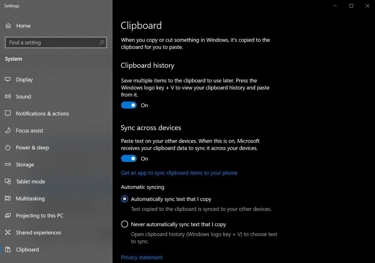 여러 장치를 번갈아 이용하는 사람들이 많다. 여러 PC를 번갈아 사용하는 경우, 윈도우 10 동기화 기능(마이크로소프트 계정과 연결)을 이용하면 모든 시스템을 동일한 자신의 장치처럼 만들 수 있다. 심지어 2018년 10월 업데이트에는 클립보드 내용을 옮기는 기능도 추가되었다. 새로 도입된 클라우드 클립보드는 특정 PC의 텍스트를 다른 장치로 복사해 붙여 넣을 수 있는 기능이다. 여기에 더해, 2018년 10월 업데이트에는 새로운 클립보드 기록이라는 기능도 추가되었다.