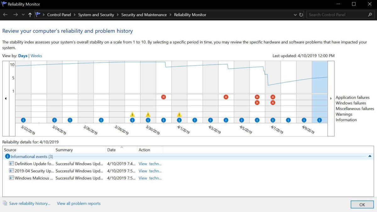 마지막은 거의 알려지지 않은 도구이다. 시스템의 하드웨어, 소프트웨어에 문제가 발생하기 전, 이를 경고해 줄 수 있는 도구이다. 윈도우 안정성 모니터는 매일, 그리고 사례 별로 시스템 상태의 스냅샷을 제공한다. 장치의 안정성에 부정적인 영향을 초래하는 소프트웨어를 찾으려 할 때 유용한 도움을 주는 도구이다. 필자 시스템의 경우, 멋지지만 버그가 많기로 유명한 고트 시뮬레이터가 많은 문제를 초래한다.