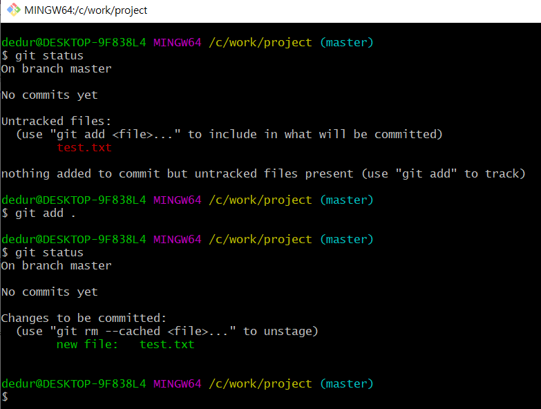 - test.txt파일이 인덱스(Staging Area)에 포함 된 것을 확인할 수 있다.