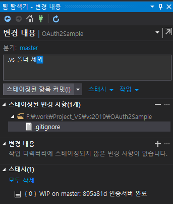이제는 비주얼 스튜디오가 업데으트되서 제외 파일 생성만 해도 기본 규칙에 '.vs'파일이 들어갑니다.