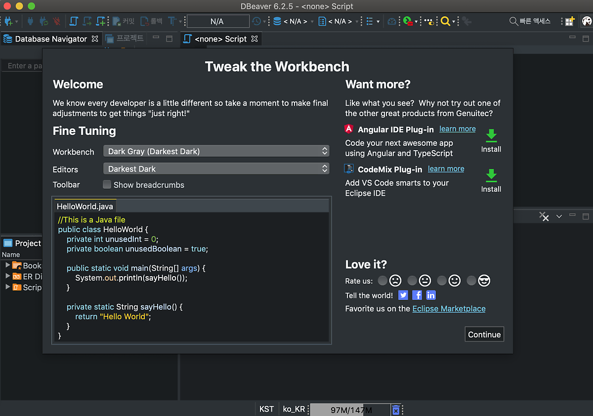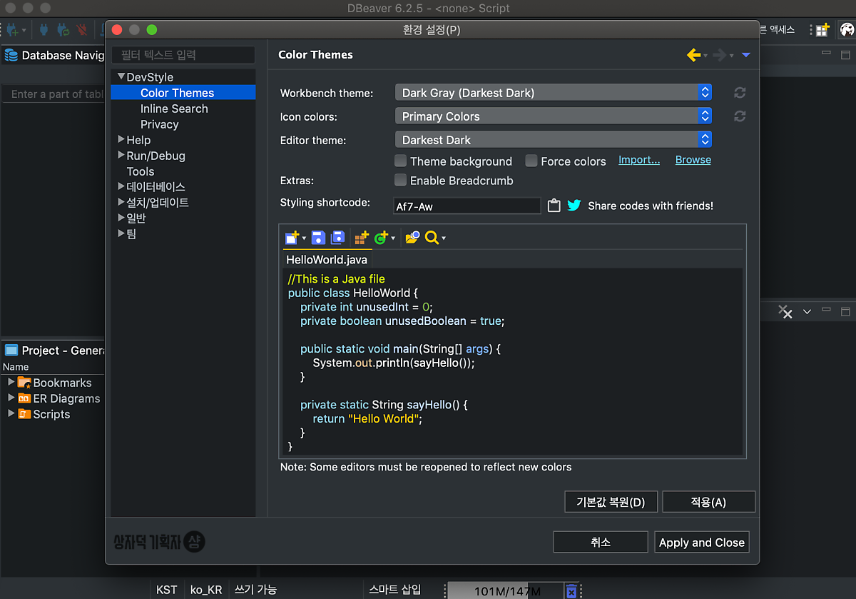 • 재시동 후, DBeaver 실행시 새로운 테마 적용된 화면 및 세팅창이 뜬다.