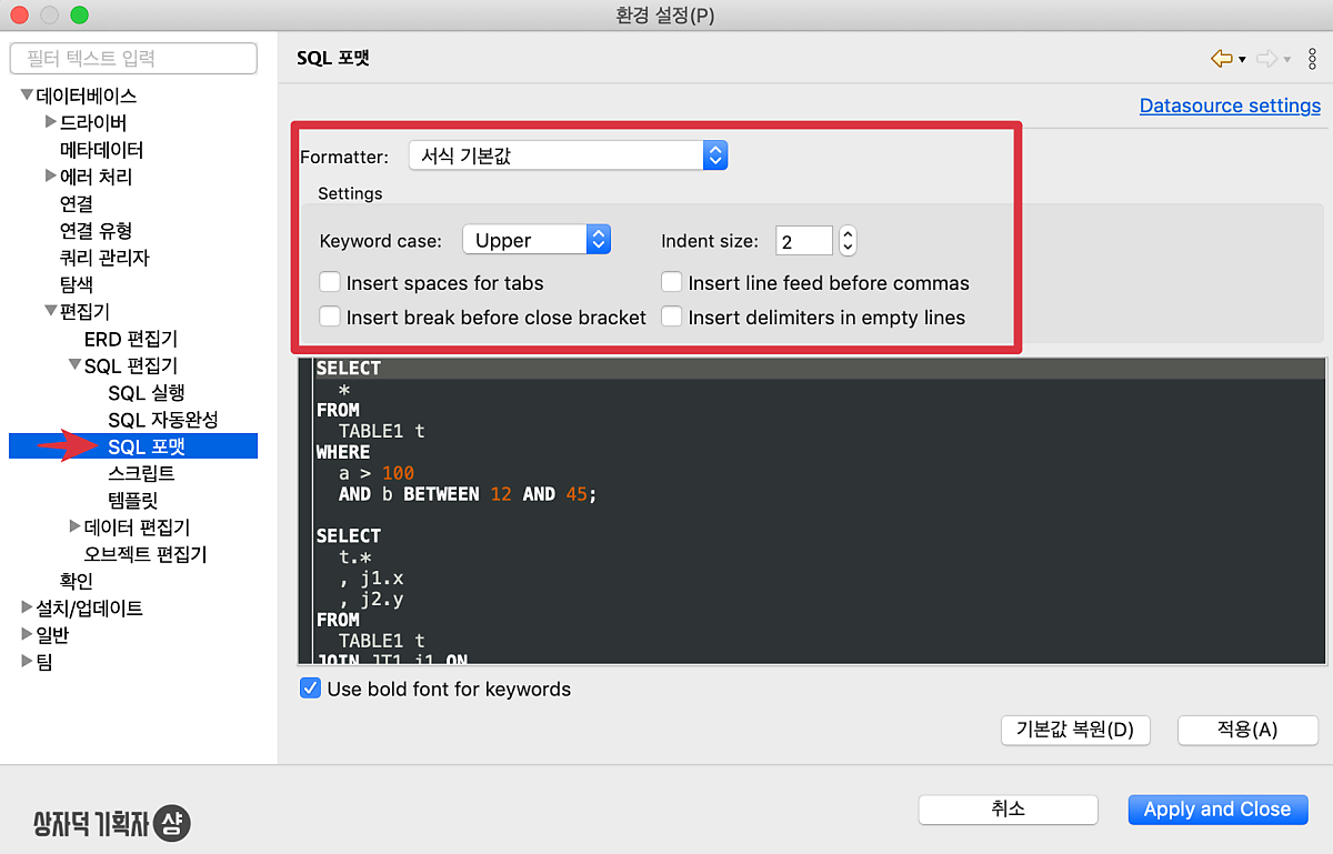 • 환경설정 실행 (cmd + ,) → 데이터베이스 > 편집기 > SQL편집기 > SQL 포맷