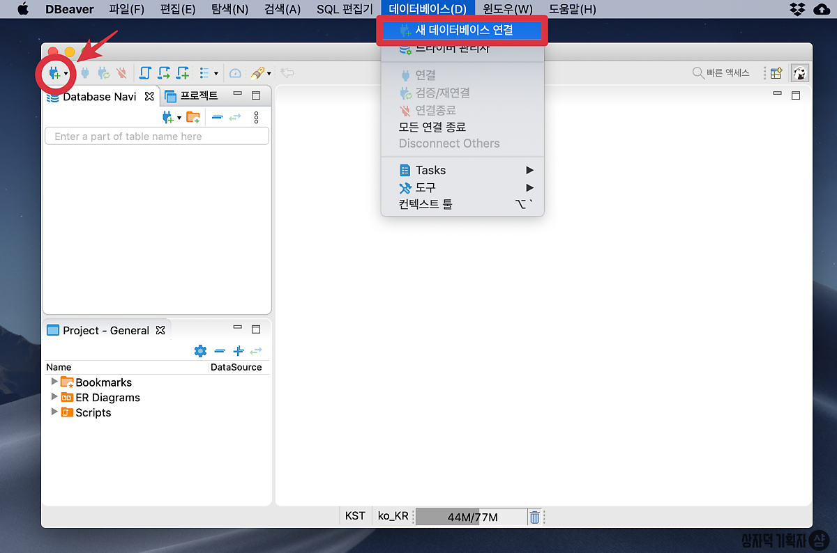 2. 새 데이터베이스 연결(New Connection) 실행 (아이콘 or 메뉴선택)