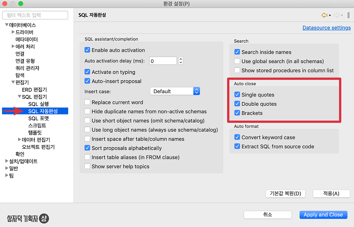 • 환경설정 실행 (cmd + ,) → 데이터베이스 > 편집기 > SQL편집기 > SQL 자동완성