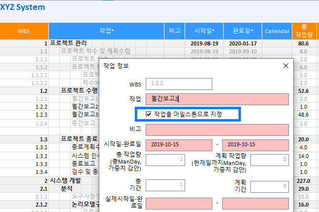 * 마일스톤으로 지정된 작업은 작업량은 계산되지 않는다(작업량이 0)
