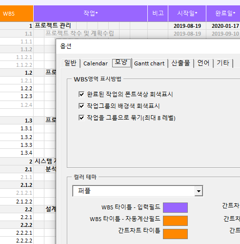 입력된 작업 일정대로 간트차트를 표시한다. 옵션에서 작업명/날짜표시 여부, 간트차트 간격, 축소/확대 비율, 컬러 테마 등을 설정할 수 있다. [보기]