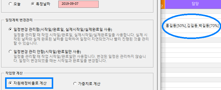 엑셀간트(XLGantt)가 4.0으로 업그레이드되면서 작업량 계산방식은 “자원배정비율 계산”방식과 “가중치 계산”방식 2가지를 제공한다.”자원배정비율 계산”방식은 Schedule시트의 담당 열에 “홍길동,김길동” 또는 “홍길동[50%], 김길동” 등의 형식으로 입력하면 배정된 인력의 비율대로 작업량을 계산해 준다. [보기]