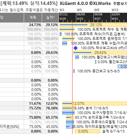 프로젝트를 진행할 때 전체 진행상황파악을 위해 진척율을 사용하는데 엑셀간트에서는 어떻게 진척율을 관리하고 프로젝트의 진행상황을 파악하는 지 알아보자. [보기]