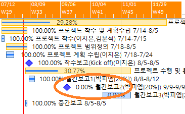 마일스톤으로 지정된 작업은 간트차트에 마일스톤(다이어몬드표시)으로 표시된다.